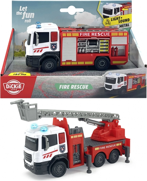 Camion de pompiers avec lumière et son, cabine en métal, parties mobiles. Longueur 17 cm. Deux modèles, livraison selon disponibilité. Super jouet pour les petits sauveteurs.