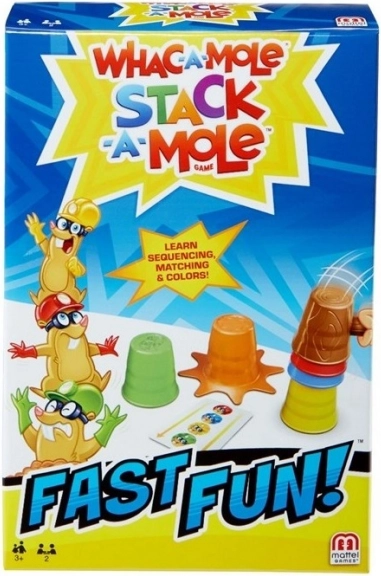 Frappe la Taupe de la marque Mattel est un jeu rapide offrant amusement et compE9tition pour deux joueurs. Au dE9but, vous retournez une carte et votre objectif est, 00 l'aide du marteau pliable, d'associer les couleurs sur la carte avec les gobelets colorE9s qui reprE9sentent les taupes.
