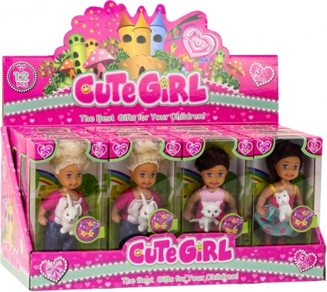 Adorable mini poupée avec petit animal, longs cheveux coiffables et tenue colorée. Format compact, finition de qualité, certifications CE et EN71. 3+.