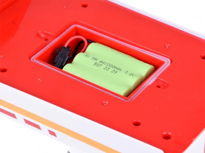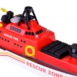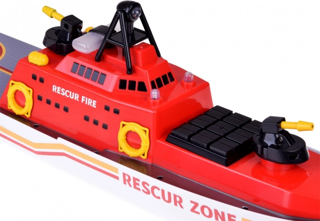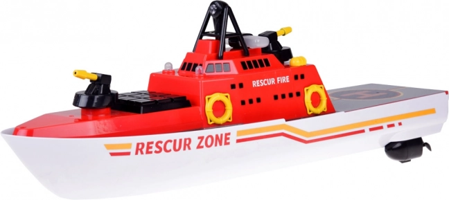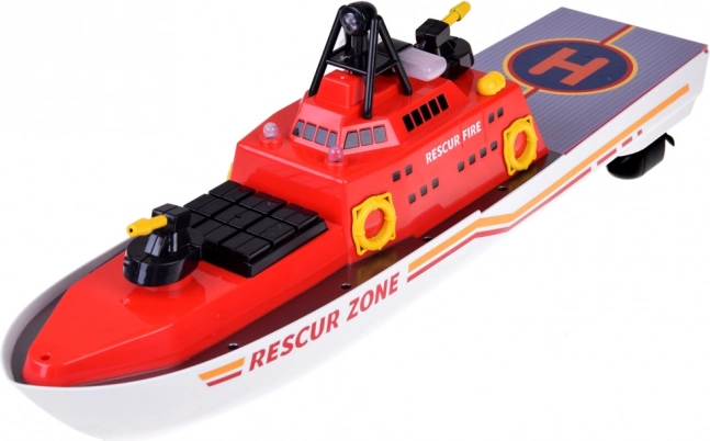 La combinaison de couleurs rouge, blanche et jaune avec des détails tels que les canons à eau et les antennes contribue à l'aspect authentique du bateau de sauvetage.