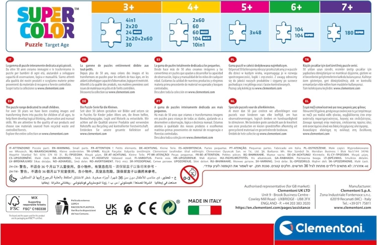 Conçu spécialement pour les enfants, le puzzle aide à développer la dextérité manuelle et le sens de l’observation. La qualité des matériaux et la technique d’impression exclusive garantissent des couleurs durablement belles, vives et éclatantes. L’emballage contient un ensemble de trois puzzles avec le même nombre de pièces et les mêmes dimensions.