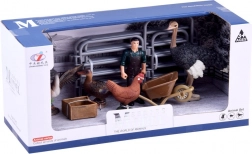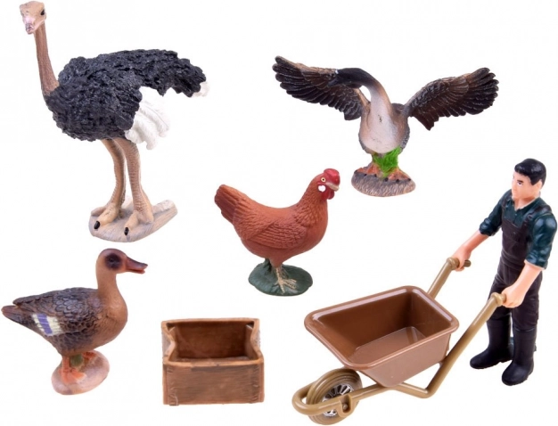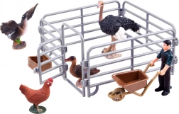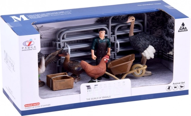 - autruche, poule, oie, canard, fermier avec brouette, enclos et accessoires