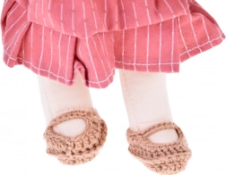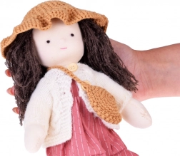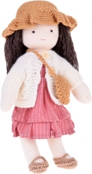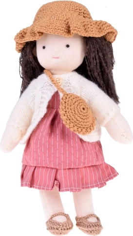 La poupée est vêtue de tons roses et beiges : elle porte une robe rayée, un cardigan tricoté, un chapeau, des chaussures assorties et un petit sac. De longs cheveux foncés et des détails soigneusement travaillés confèrent à la poupée un charme unique. La boîte en carton élégante en fait un magnifique cadeau pour un anniversaire ou Noël.