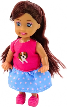 Poupée aux longs cheveux bruns, tenue rose et bleue et petites chaussures roses, elle donne vie à chaque histoire.