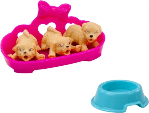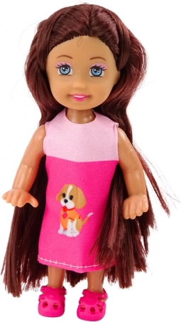 .La petite poupée avec trois chiots dans leur tanière est un jouet adorable et compact, idéal pour les filles qui aiment les poupées et les animaux. La poupée porte une robe colorée, soigneusement détaillée, et ses longs cheveux bruns peuvent être peignés et coiffés à volonté. Elle est accompagnée de trois petits chiens dans leur panier, qui rendent le jeu encore plus amusant.