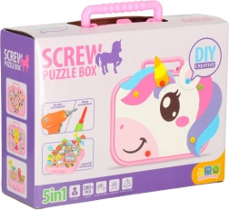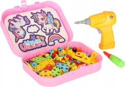 Le jeu est rangé dans une valisette en plastique résistante avec une plaque perforée pour visser. Grâce à son riche équipement et aux autocollants au motif licorne, le jeu est amusant pour un enfant seul comme pour un groupe.