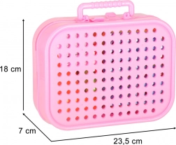 Légère valisette rose avec ouvertures d’aération et poignée, elle maintient toutes les pièces ensemble et sert de base de travail pour le vissage.