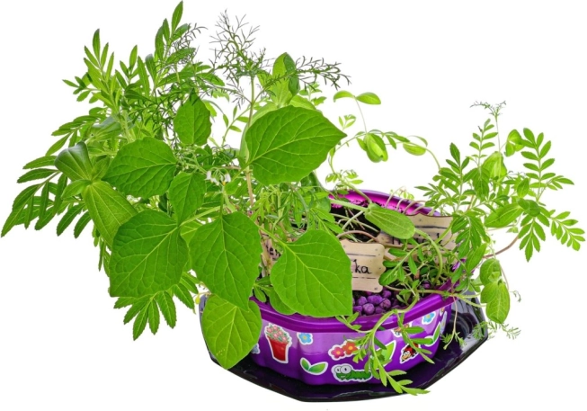 4 couleurs, 3 sachets de graines (pâquerette, zinnia, cosmos), 1 sachet de fibres de coco, 1 pinceau, 1 pot de fleurs avec soucoupe, 1 feuille A4 d’autocollants, 1 tube de paillettes