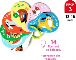 14 illustrations (7 cartes rigides recto-verso), anneau de liaison, guide pour les parents