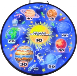 La cible en tissu Space Adventure à surface auto-agrippante offre un jeu sûr sans pointes. Des zones clairement marquées avec des points encouragent la compétition et l’apprentissage du calcul.