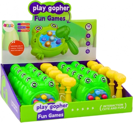 Le mini‑jeu en forme de grenouille verte est une version portable du classique Wac‑a‑Mole : des cibles surgissent de façon inattendue des ouvertures et l’objectif est de les frapper le plus vite possible avec le marteau fourni. Grâce à ses dimensions compactes, il se glisse facilement dans un sac pour une sortie, un pique‑nique ou les vacances.
