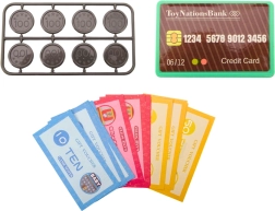Le set comprend des pièces en plastique, des billets/petits chèques en papier et une carte de paiement pour s’entraîner aux paiements en espèces et sans contact.
