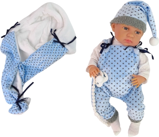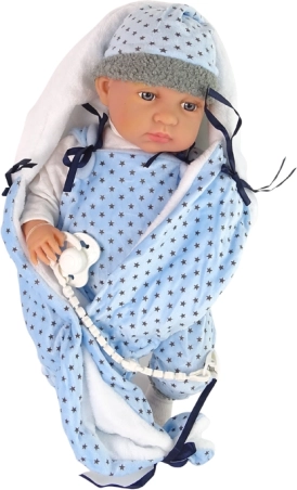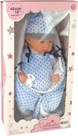 Cette poupée de 46 cm présente une apparence réaliste, avec des bras, des jambes et une tête mobiles, ce qui contribue à une expérience de jeu vraiment authentique. Les matériaux doux et agréables garantissent une sensation plaisante au toucher. L’enfant peut s’amuser avec des tenues interchangeables, car la poupée possède des vêtements faciles à changer. La tenue comprend un pyjama bleu et noir et une couverture motif étoiles.