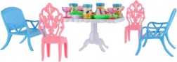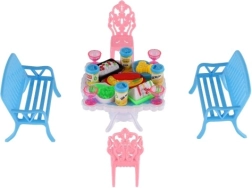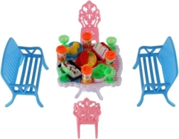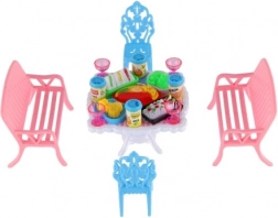 Le set comprend 2 bancs, 2 chaises et une table, accompagnés de 13 accessoires – verres, canettes, assiettes et plateau. Tout le nécessaire pour le festin de vos poupées.