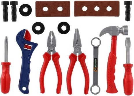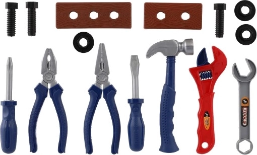 Le kit comprend des outils typiques tels qu’un marteau, un tournevis, des pinces et une clé, ainsi que des écrous et des vis pour s’exercer à visser. Grâce au sachet pratique, ranger et transporter le kit est un jeu d’enfant – idéal aussi comme cadeau.