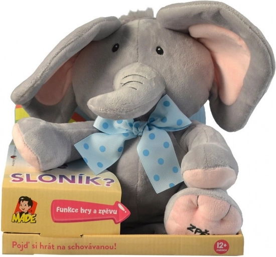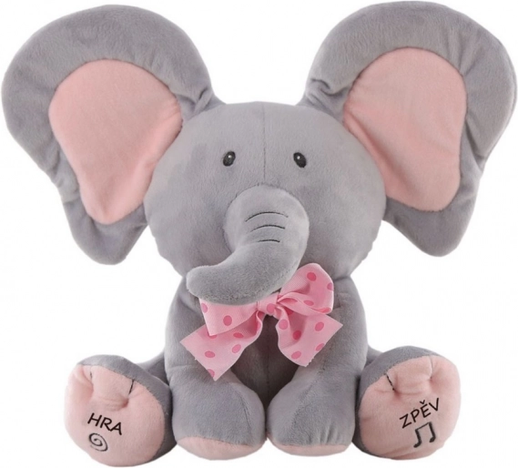 Éléphanteau en peluche interactif 25 cm qui parle tchèque, chante et joue à cache-cache. Agite ses oreilles, adapté dès 12 mois. Superbe cadeau pour les tout-petits.
