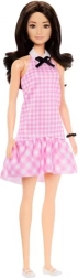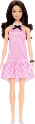 La poupée Barbie Fashionistas propose une interprétation moderne du style rétro inspiré du look Quick Curl de 1973. La robe rose à motif vichy est rehaussée d’un nœud noir au décolleté, de chaussures blanches et d’un bracelet noir – l’ensemble compose une tenue chic pour jouer au quotidien comme pour les grandes occasions.