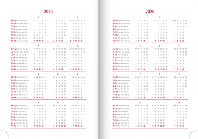 • calendrier à partir de décembre 2024 • calendrier mensuel 2025 • calendrier mensuel 2026 • calendrier annuel 2025-2026 • calendrier de travail • jours fériés en République tchèque et slovaque et fêtes internationales • liste élargie des prénoms tchèques • carte de la République tchèque et slovaque • espace pour les informations personnelles • signet en tissu • coins perforés • espace pour les notes.