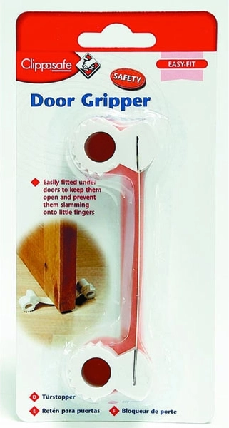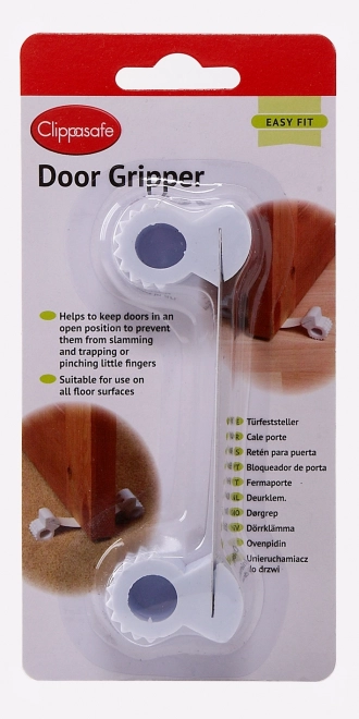 Le frein de porte Clippasafe maintient la porte ouverte et empêche les enfants de claquer la porte et de se coincer ou de se pincer les doigts.
