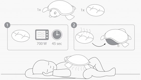 Astuce : placez le coussin préalablement chauffé dans le lit avant le coucher pour une agréable sensation de chaleur et de sécurité. Respectez toujours les consignes de sécurité lors du chauffage et utilisez sous la surveillance d’un adulte.