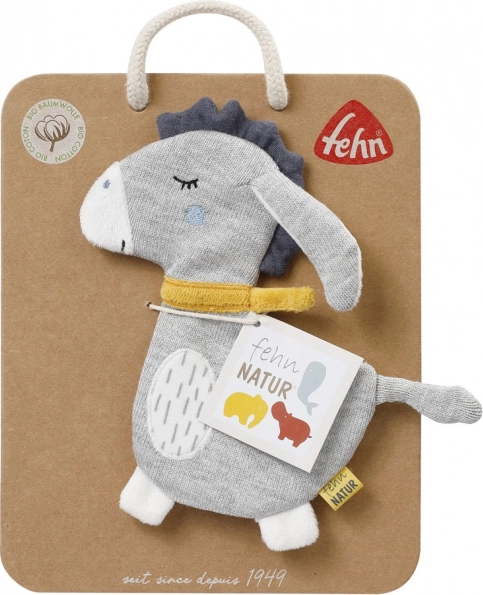 Le corps tricoté de l’âne est fabriqué en coton biologique et contient un papier bruissant qui émet un son lorsqu’on le presse. Ce jouet de préhension stimule de manière ludique l’ouïe, la prise en main, le toucher et la motricité fine de bébé. Sa taille pratique permet d’emmener l’âne partout avec soi.