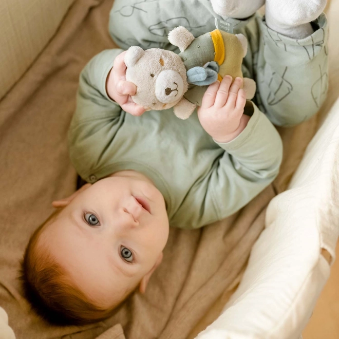 Cet ourson doux avec hochet stimule le toucher, l’ouïe et la motricité de l’enfant. Les différentes textures et sons éveillent la curiosité et aident au développement des compétences.