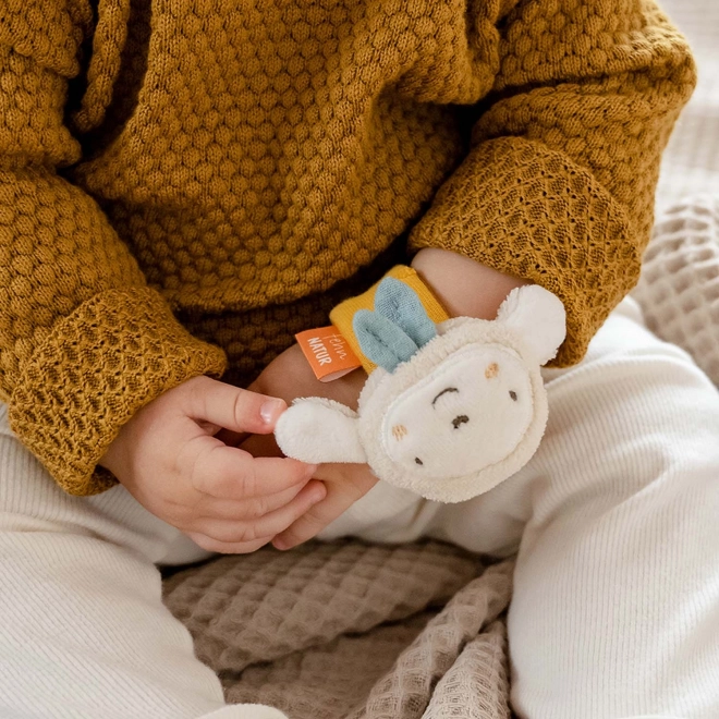 Se met facilement au poignet et, lorsque le bébé bouge et secoue les mains, il émet des sons fascinants que les tout-petits adorent. Le bracelet hochet stimule de manière ludique l’ouïe, la préhension, le toucher et la motricité fine du bébé.