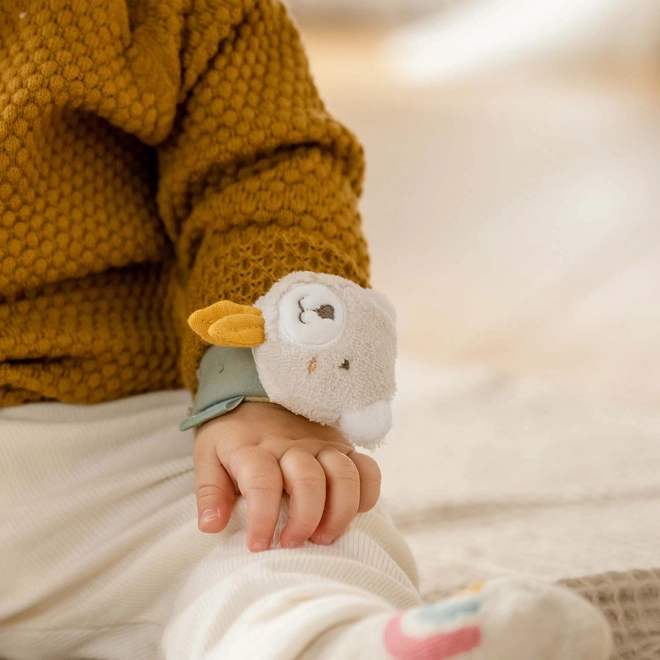 Se fixe facilement au poignet et, lorsque le bébé bouge et secoue ses petites mains, il émet des sons fascinants que les tout-petits adorent. Le bracelet hochet stimule de manière ludique l’ouïe, la préhension et le toucher du bébé ainsi que la motricité fine.