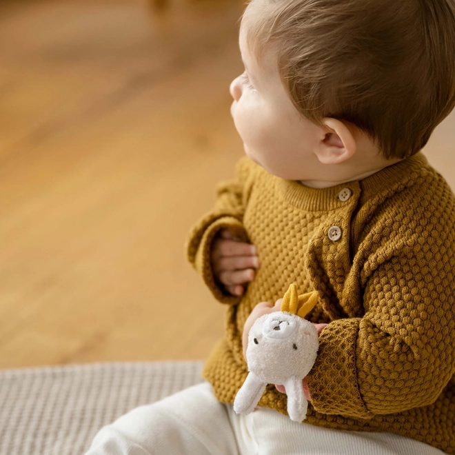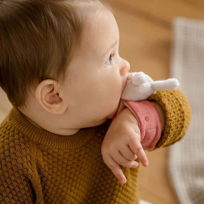 Se met facilement au poignet et, lors des mouvements du bébé – en secouant les mains – émet des sons fascinants que les tout-petits adorent. Le bracelet hochet stimule de manière ludique l’ouïe, la préhension et le toucher de bébé ainsi que la motricité fine.