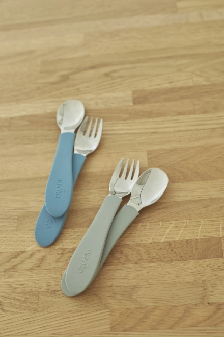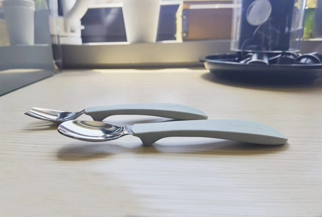 La cuillère et la fourchette disposent d’un support hygiénique « sans contact » qui évite tout contact direct avec les surfaces. Le manche des couverts est ergonomique, ce qui permet une prise en main facile même pour les enfants qui apprennent à manger seuls. Grâce au manche en silicone, la cuillère ne glissera pas des petites mains des enfants.