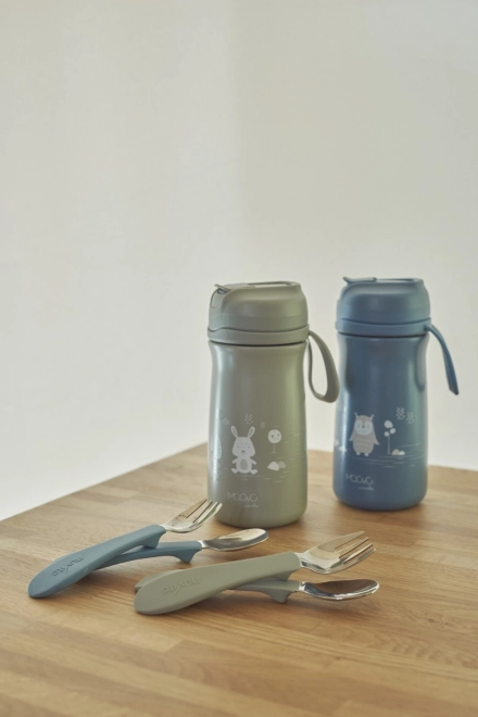 La cuillère et la fourchette sont dotées d’un support hygiénique « sans contact » qui évite tout contact direct avec les surfaces. Le manche des couverts est ergonomique, ce qui permet une prise en main facile même pour les enfants qui apprennent à manger seuls. Grâce au manche en silicone, la cuillère ne glissera pas des petites mains des enfants.