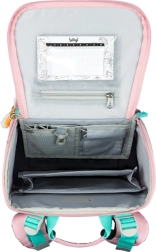 Le nouveau système d’ouverture à bascule permet d’accéder aux fournitures directement depuis le pupitre. À l’intérieur, une poche transparente pour l’emploi du temps, un organiseur avec élastique et une poche frontale isolée pour la fermeture.