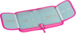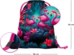Le cartable est complété par une trousse à un étage sans contenu et un sac résistant avec mousqueton pour l’attacher au cartable. Le tout dans un motif tropical ludique avec des flamants.