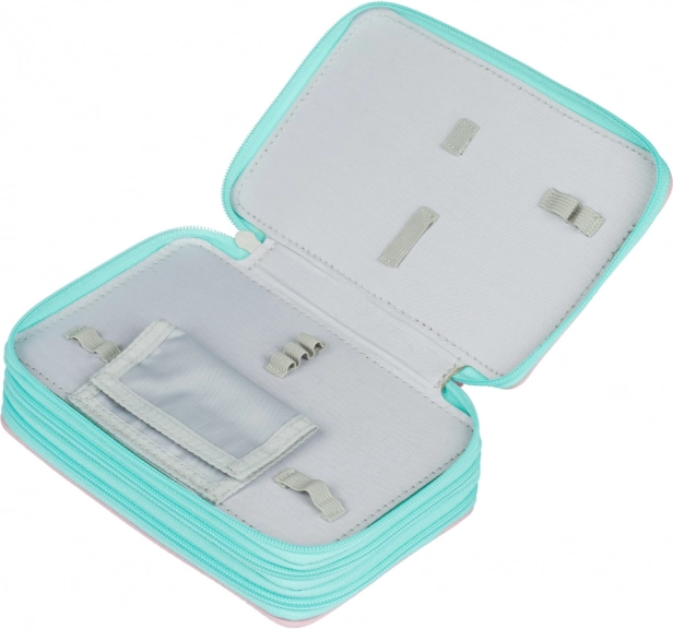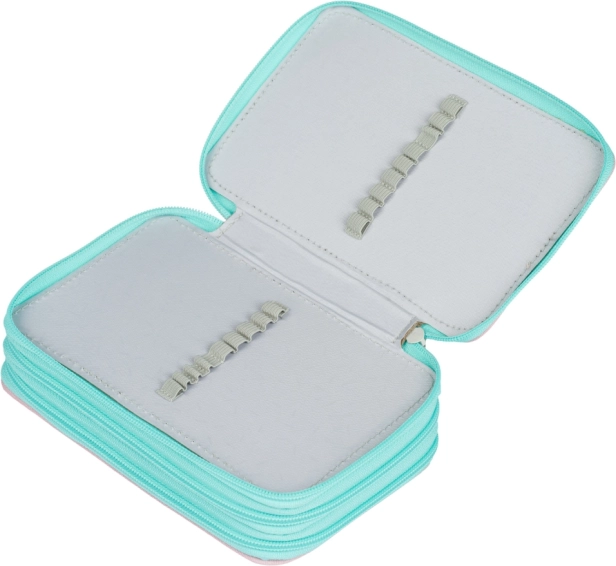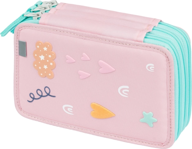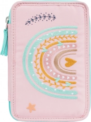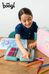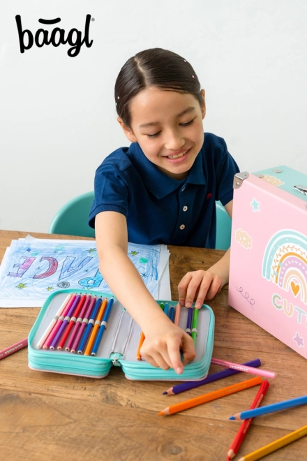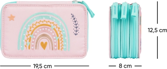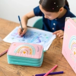 Trousse BAAGL élégante et pratique à trois étages, de couleur rose avec motif arc‑en‑ciel, offrant une organisation extra spacieuse pour toutes les fournitures d’écriture. Grâce aux élastiques pour crayons épais et feutres, au dos renforcé et aux fermetures éclair YKK fiables, c’est un choix idéal pour les écoliers. La trousse est vendue sans contenu.
