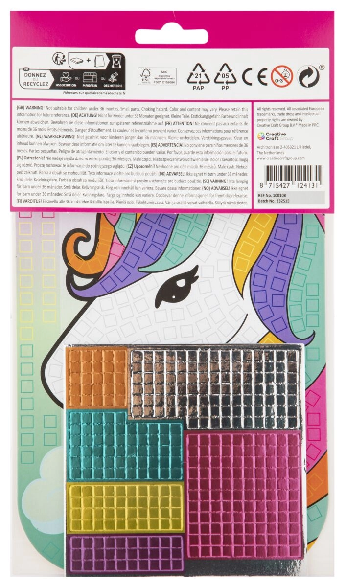 Créez vos propres mosaïques colorées avec le kit créatif Mosaic Art au format A5. Les enfants collent des autocollants multicolores sur des modèles préimprimés et, en un rien de temps, naît une image mosaïque captivante. Choix de motifs : papillon, dinosaure, licorne et aquarium. Idéal pour le développement de la motricité fine, de la créativité et de la patience. Convient dès 3 ans.