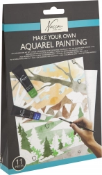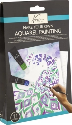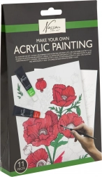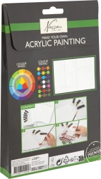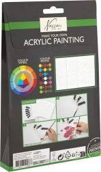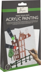 Comprend 11 pièces : différentes peintures acryliques, pinceaux, toile pré-dessinée et guide qui vous accompagnera pas à pas dans le processus de peinture.