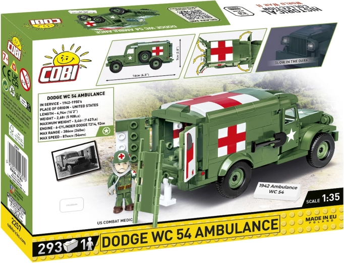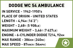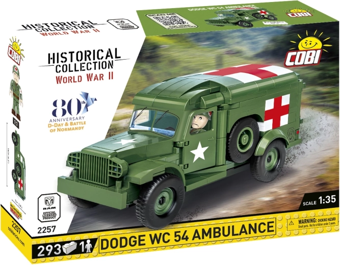 Cette maquette réaliste du Dodge WC 54 permet de recréer une page d’histoire avec des détails authentiques. Le modèle est à l’échelle 1:35 et, grâce à la licence RAM TRUCKS, offre une haute qualité et une grande précision. Avec ses 293 briques et sa figurine, elle est idéale non seulement pour les constructeurs, mais aussi pour les passionnés d’histoire militaire.