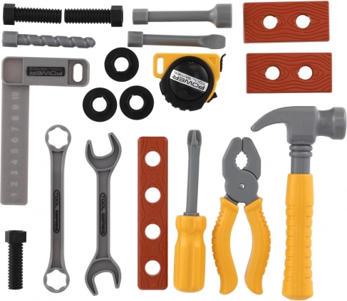- Sélection d’outils pour enfants (marteau, pince, tournevis, clés, vis, écrous, rondelles, plaquettes, etc.)