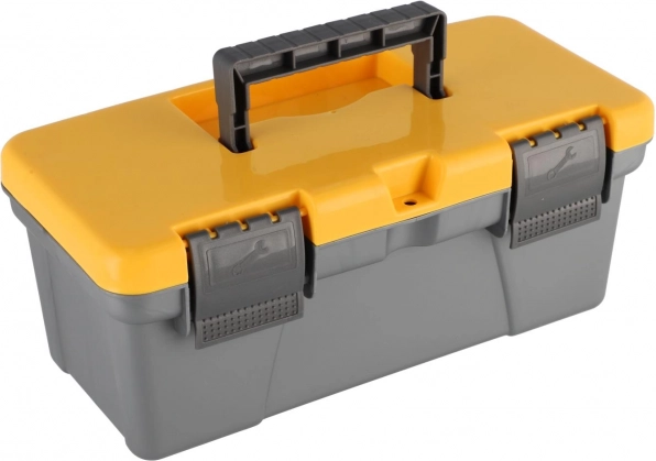 La valisette robuste en plastique, avec poignée et loquets, garde toutes les pièces ensemble et se transporte facilement.