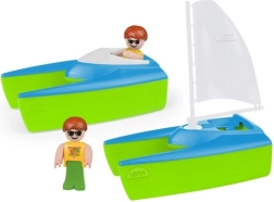 Ensemble de voiliers Catamaran Lena pour des jeux amusants au bord de l'eau. Contient un voilier et un catamaran avec une voile et deux figurines de surfeurs.