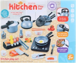 L'ensemble comprend également une bouilloire, une poêle, une casserole, une cocotte-minute, un gril et plus de 30 autres pièces d'ustensiles de cuisine, comme des pinces et des aliments factices. Parfait pour stimuler le jeu créatif et favoriser le développement des compétences motrices.