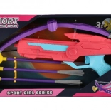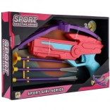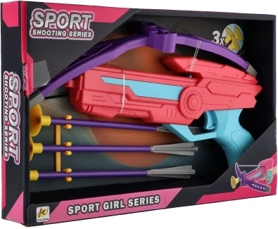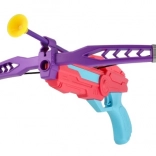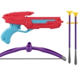 Arbalète en plastique colorée avec trois flèches à ventouses offrant un tir sûr et amusant pour les enfants.