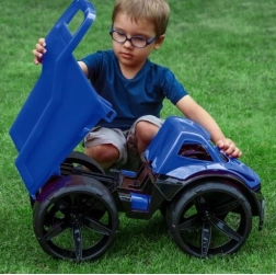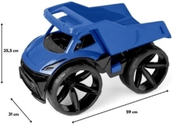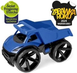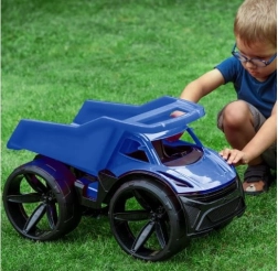 Le camion-benne basculant MAXIMUS séduit par son design futuriste, sa couleur bleu vif et ses finitions détaillées. Le large pare-chocs, les phares inclinés et les surfaces contrastées donnent au jouet un aspect moderne qui stimule l’imagination des enfants.