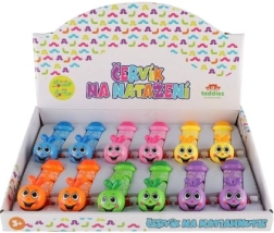 Tournez la vis latérale et le ver avance tout seul. Un mécanisme simple que les enfants adorent répéter encore et encore.