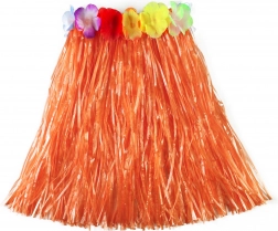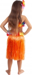 Une jupe orange éclatante avec bordure fleurie crée en un instant une ambiance tropicale pour toute fête ou représentation. L’image montre une stylisation possible – l’emballage contient uniquement la jupe.