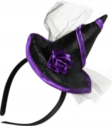 Ce serre-tête de sorcière stylé est l’accessoire parfait pour soirée, carnaval et Halloween. Il combine une finition noir‑violet, un mini chapeau en satin et une décoration florale en tulle pour un look saisissant et photogénique.