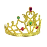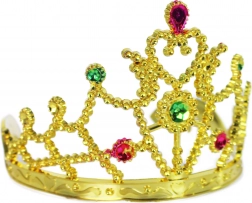 La tiara dorée est sertie de pierres multicolores, parmi lesquelles se distinguent le vert et le rouge. Elle apporte une touche royale à toute tenue.
