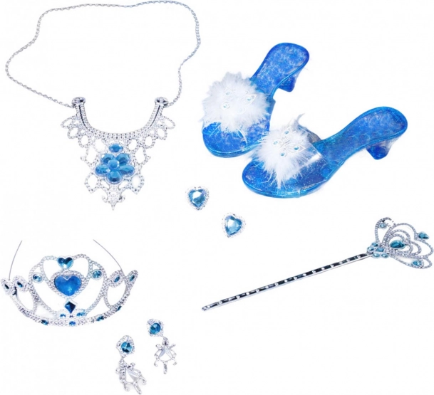 Devenez une princesse d'hiver avec cet ensemble d'accessoires magnifique comprenant des chaussures de luxe, une couronne élégante, un sceptre, un collier éblouissant avec des boucles d'oreilles et une bague.