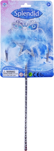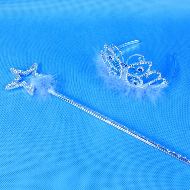 Cet ensemble exclusif offre tout ce dont une petite princesse a besoin pour ses aventures magiques. Il comprend un magnifique diadème argenté décoré de pierres bleues et une baguette élégante. Les deux sont ornés de délicates plumes bleues, ajoutant beauté et magie. Idéal pour jouer à la princesse, les fêtes costumées et d'autres activités créatives.