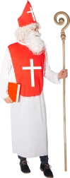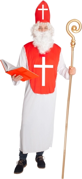 Ce costume de Saint‑Nicolas pour adulte comprend une longue robe blanche (env. 145 cm depuis les épaules) et un plastron rouge avec une grande croix blanche. Il inclut également une coiffe avec fermeture velcro pour une fixation rapide et sûre. Grâce à sa coupe universelle, le costume est confortable à porter et facile à superposer.